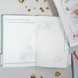 Calidad y Estilo: Pasta dura con grabados en foil dorado y esquinas redondeadas. Tamaño A5, el balance perfecto entre espacio y portabilidad.