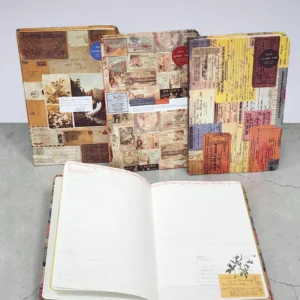 Diseño Collage: Pasta dura con impresión de alta calidad que simula texturas de papel envejecido y tipografías clásicas.