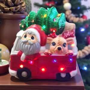Figura de Cerámica de Combi Navideña con Santa, Reno y Pino con Serie de Luces 30 x 20cm