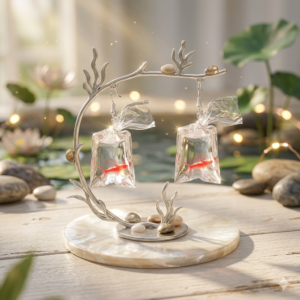 Estos aretes son la combinación perfecta de creatividad y estilo kawaii. Con un diseño ultra realista que simula un pececito dorado dentro de su bolsa con agua, son la pieza ideal para quienes no tienen miedo de destacar y aman los accesorios fuera de lo común.