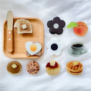 Diseños Creativos: Incluye modelos originales como una taza de café, durazno, pan tostado con huevo estrellado, hot cakes, galletas y flores decorativas.