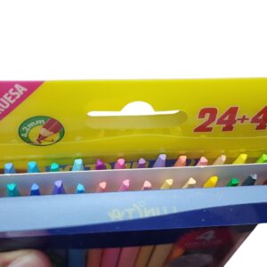 Contiene 28 Lápices triangulares incluye 4 de gratis Mina gruesa y resistente Más suaves al colorear Mayor intensidad de color 4 Piezas gratis: 2 bicolor neon y 2 bicolor metálico 24 Colores Pastel Puntilla gruesa Puntilla resistente Cuerpo triangulares Colores más intensos