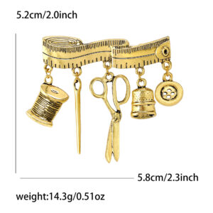 ¡Un accesorio encantador para quienes aman el arte de crear! Este pin metálico en tono dorado es un homenaje a la costura, presentando un diseño detallado con herramientas icónicas que cuelgan delicadamente.