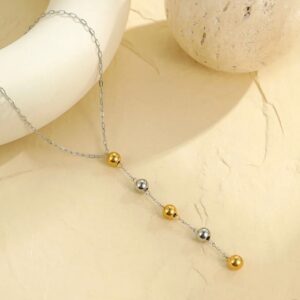 La elegancia se encuentra en los detalles más sencillos. Nuestro collar Bicolor Drop presenta una caída fluida estilo corbata, adornada con esferas pulidas en tonos contrastantes. Es la pieza perfecta para quienes aman mezclar metales y buscan un accesorio que combine con absolutamente todo.