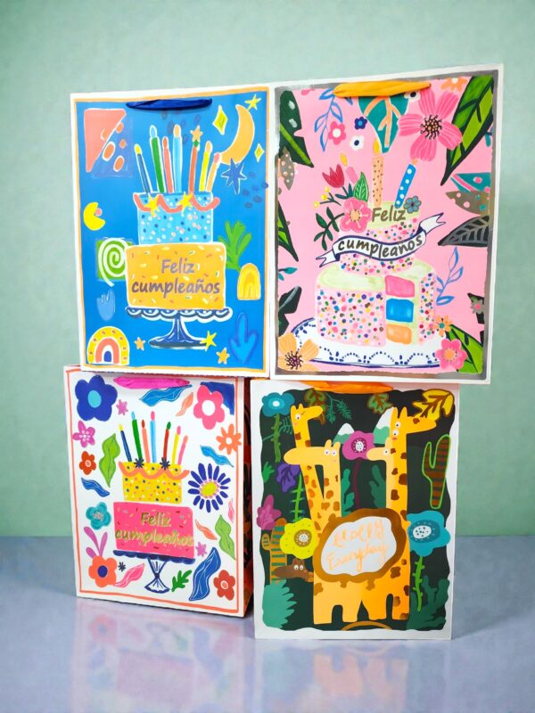 Su diseño destaca por el mensaje “Feliz Cumpleaños” acompañado de efectos de pintura colorida, creando un estilo creativo, alegre y lleno de energía festiva. Gracias a su tamaño grande, es ideal para regalos voluminosos, como juguetes, ropa, juegos de mesa o sets de regalo completos.