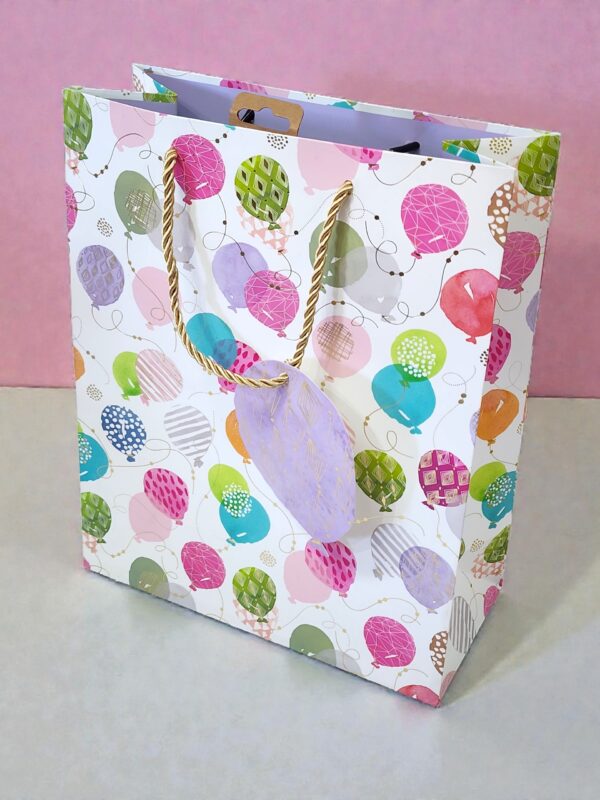 Su diseño presenta globos en tonos pastel, transmitiendo suavidad y diversión a la vez, ideal para cumpleaños, baby showers o cualquier ocasión que requiera un toque dulce y colorido. Su tamaño mediano permite guardar regalos de tamaño intermedio, como juguetes, ropa, accesorios o detalles especiales.