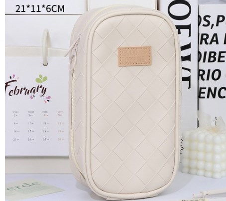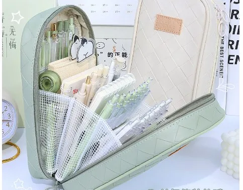 Estuche escolar de cuero sintético con diseño de color sólido y estilo coreano, ideal para el colegio y uso diario. Su acabado elegante y resistente permite guardar y proteger lápices, bolígrafos y otros útiles escolares de forma organizada.