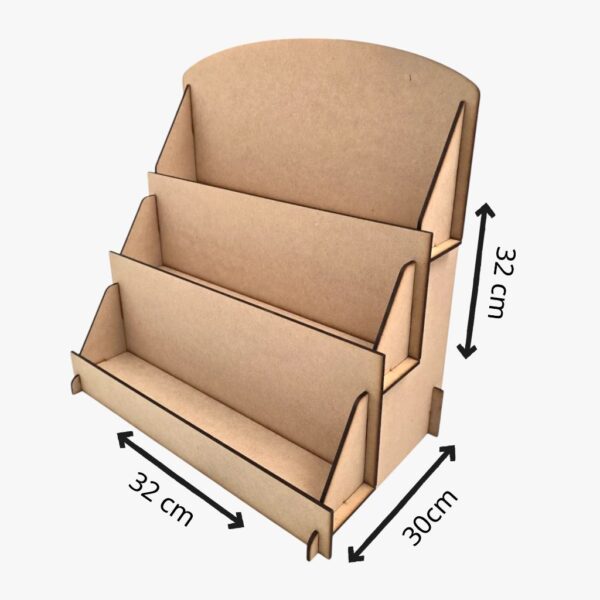Este exhibidor de MDF está diseñado específicamente para resaltar productos que merecen ser vistos de frente. Con tres niveles profundos y un elegante remate curvo, es ideal para organizar tu colección personal o para presentar mercancía de forma profesional en mostradores y bazares.