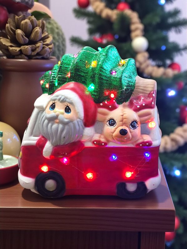Figura de Cerámica de Combi Navideña con Santa, Reno y Pino con Serie de Luces 30 x 20cm