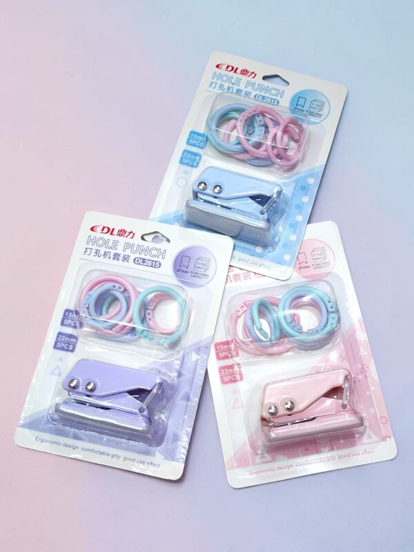 Kit Completo: Incluye 1 perforadora metálica y 8 anillas de plástico de colores pastel a juego.
