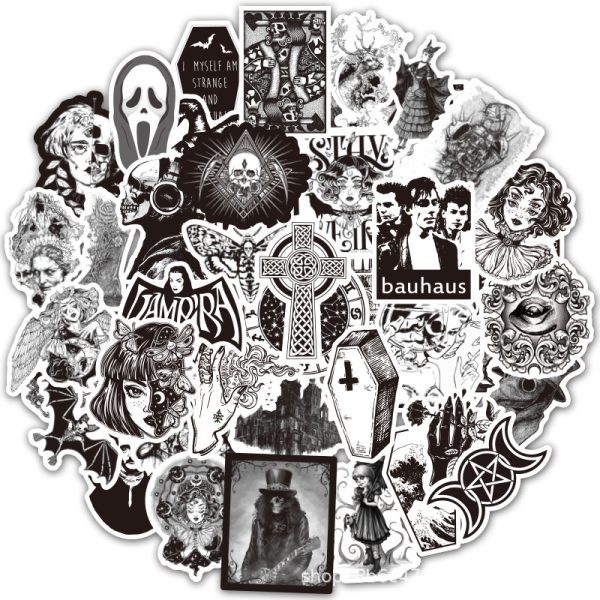 Pack con 50 Stickers Impermeables Diseños Góticos Slash Calavera Blanco y Negro