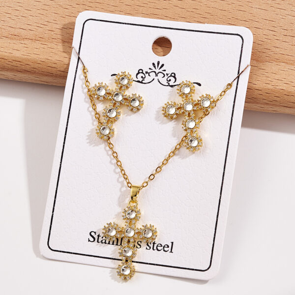 Este conjunto de collar y aretes es la definición perfecta de elegancia y resistencia. Con un diseño de cruz finamente detallado y decorado con cristales que capturan la luz desde cualquier ángulo, es el accesorio ideal para eventos especiales o para quienes aman lucir impecables todos los días.