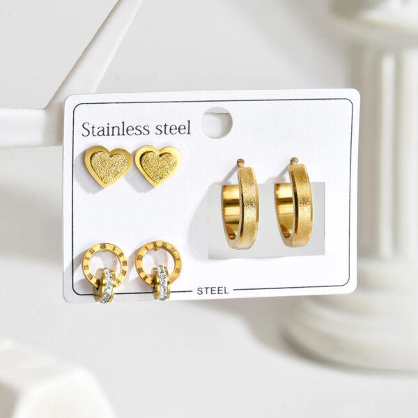 Set de 3 Pares de Aretes de Acero Inoxidable – Diseño de Corazones y Círculos Romanos