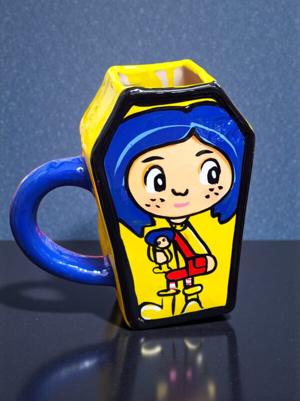 Elaborada en cerámica de alta calidad, es ideal para disfrutar café, té o chocolate caliente. Su diseño original y artístico la hace perfecta para fans de Coraline, amantes de lo alternativo o como un regalo diferente y lleno de personalidad.